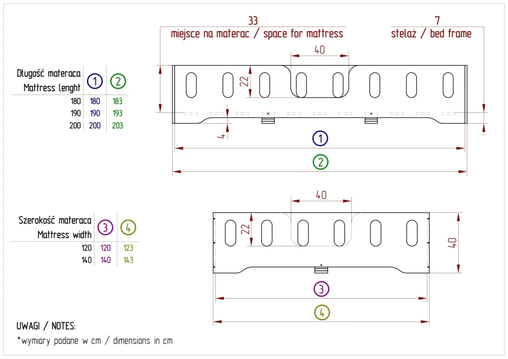Les petites dimensions sont équipées d’un sommier à lattes courbées, tandis que les tailles à partir de 120 cm de largeur disposent d’un sommier à lattes droites.