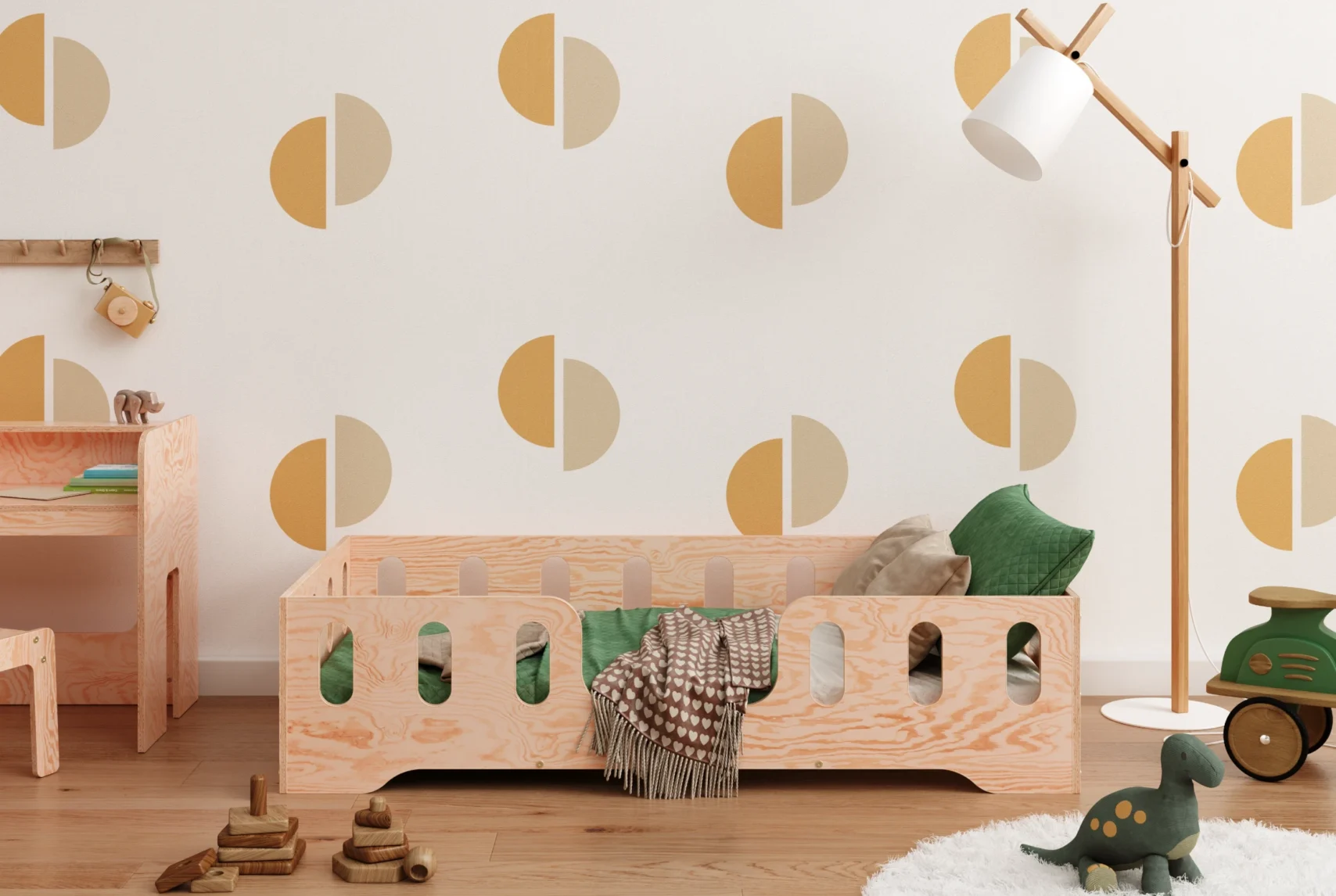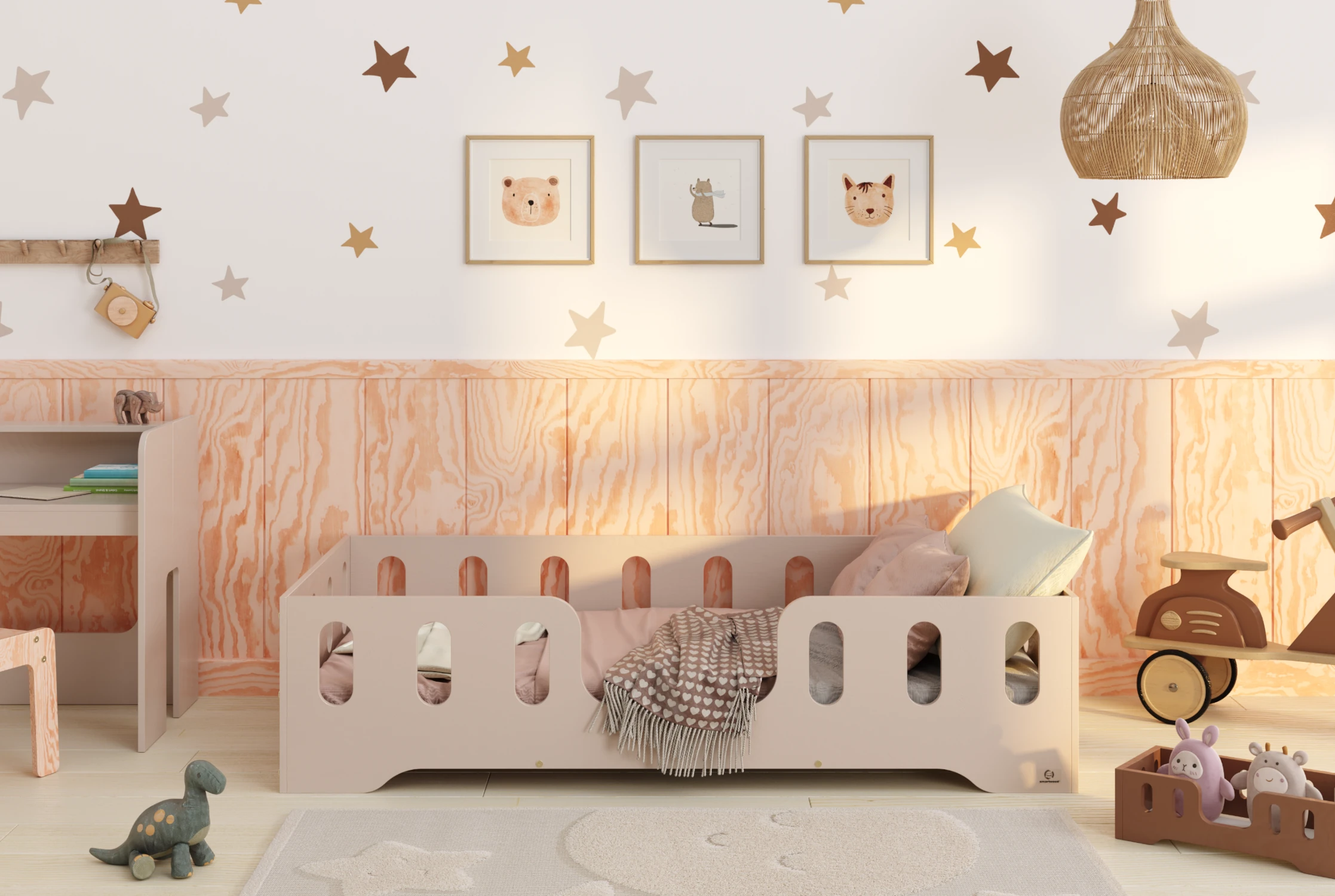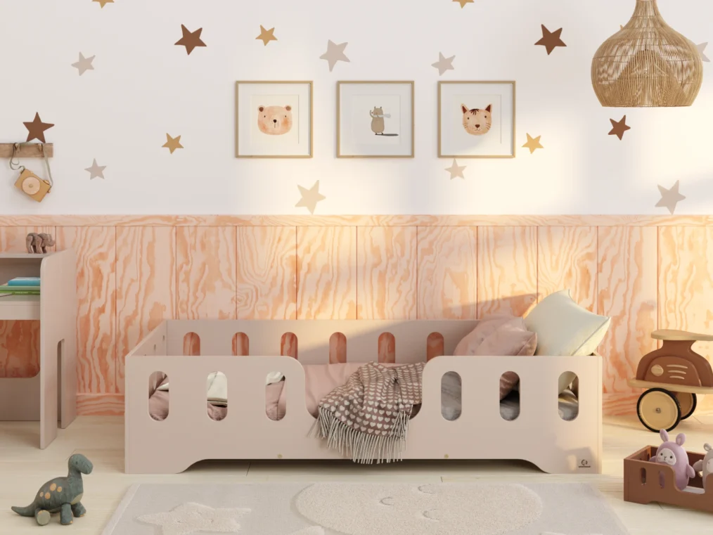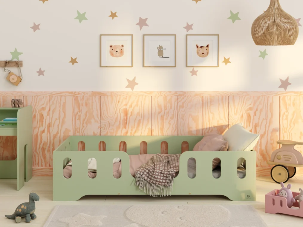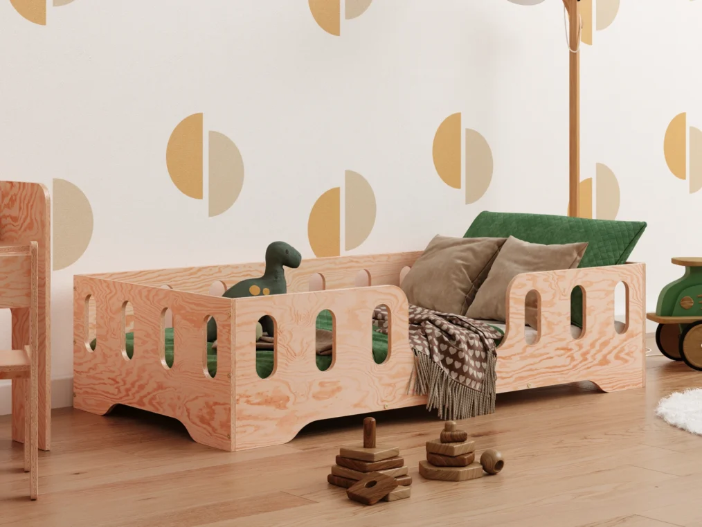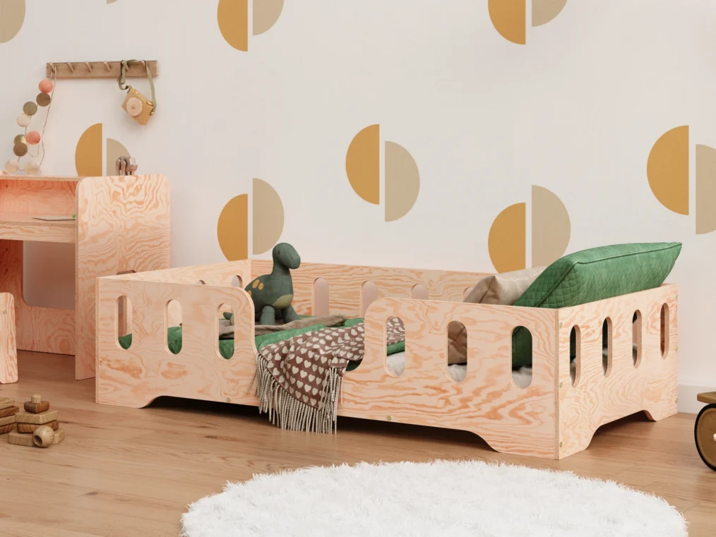 Il est équipé de côtés surélevés servant de barrière, avec des découpes longitudinales, qui protègent efficacement l’enfant contre les chutes pendant le sommeil. Ce modèle propose 4 options d’entrée au choix, pour s’adapter à la configuration de chaque chambre. Fabriqué en contreplaqué de pin de haute qualité, il se décline en 11 couleurs et 20 tailles différentes — un choix idéal pour répondre aux besoins individuels.