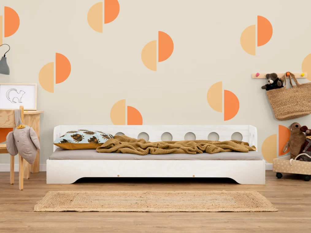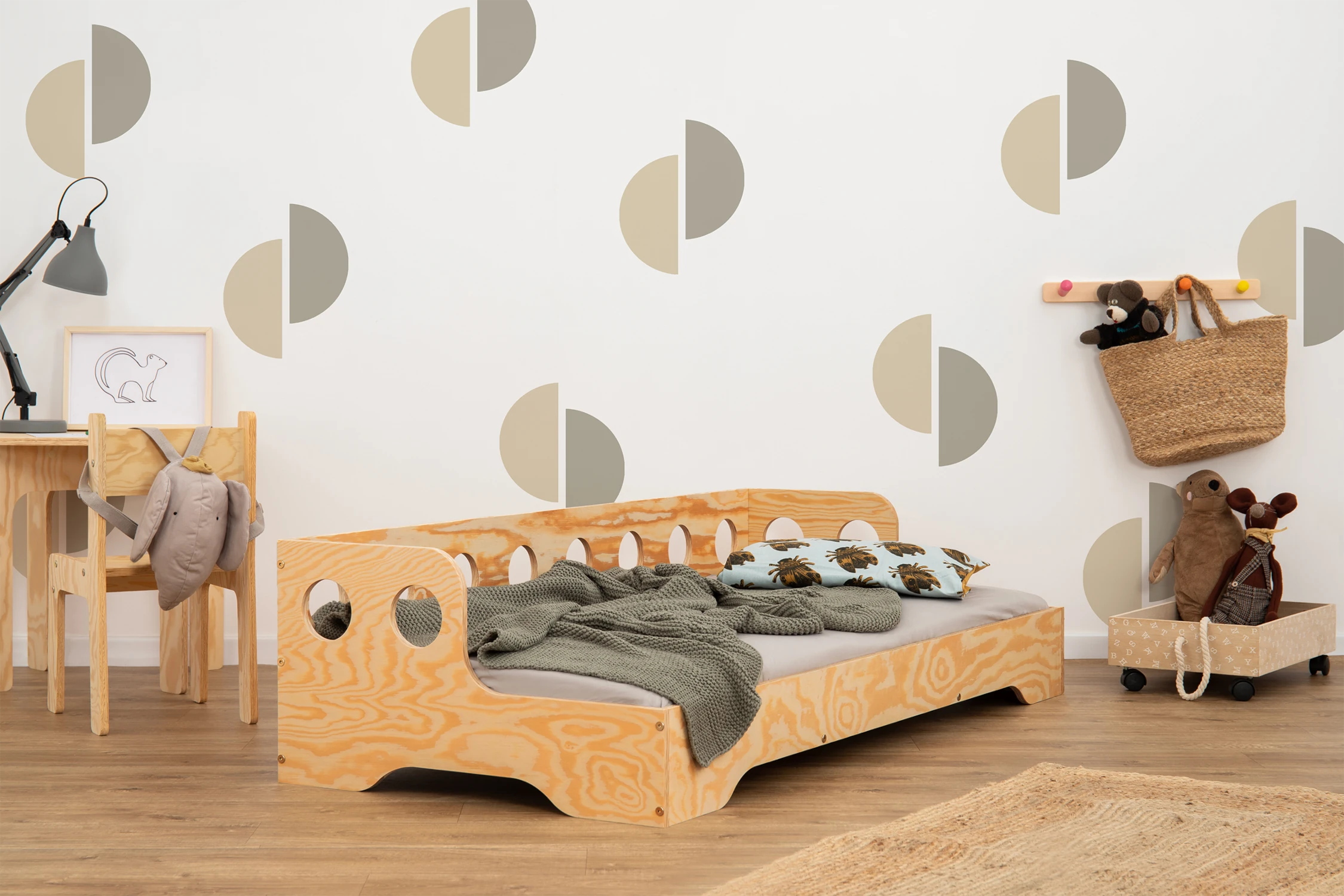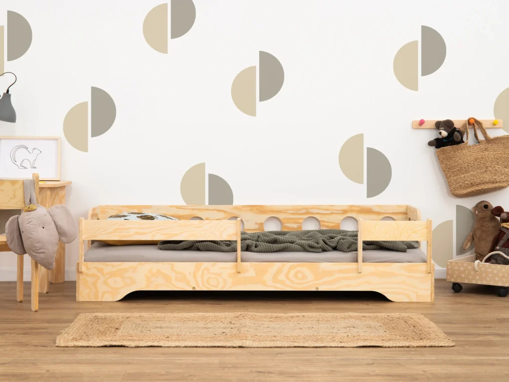 Sa conception ouverte et basse permet un accès facile, favorisant ainsi le développement de l’autonomie de l’enfant, tandis qu’une barrière avec des découpes rondes sur le long côté du lit offre un appui confortable. Fabriqué en contreplaqué de pin de haute qualité, disponible en 11 couleurs et 20 tailles, il s’intègre parfaitement dans tout intérieur.