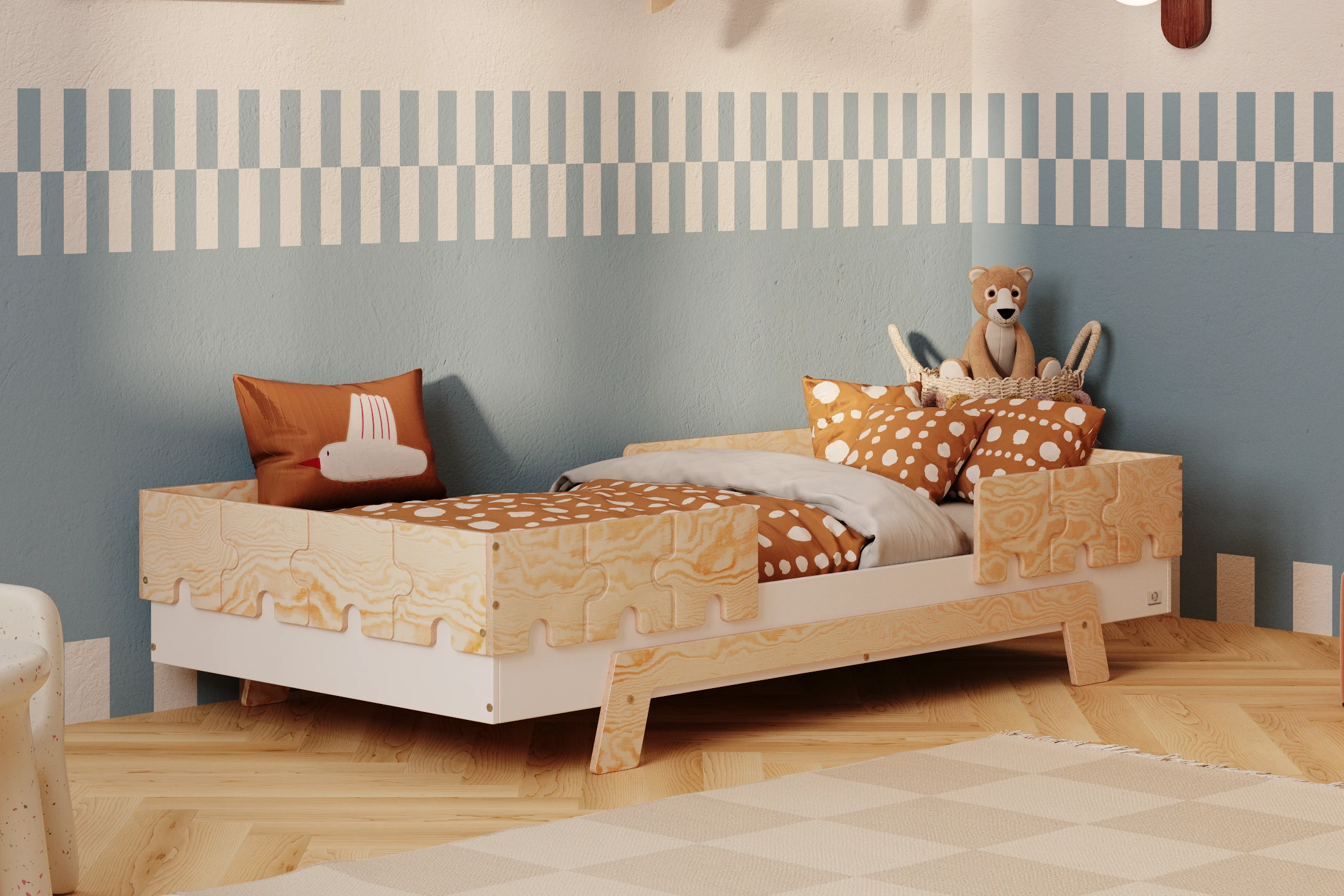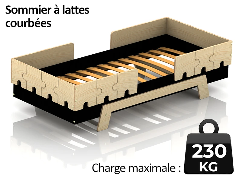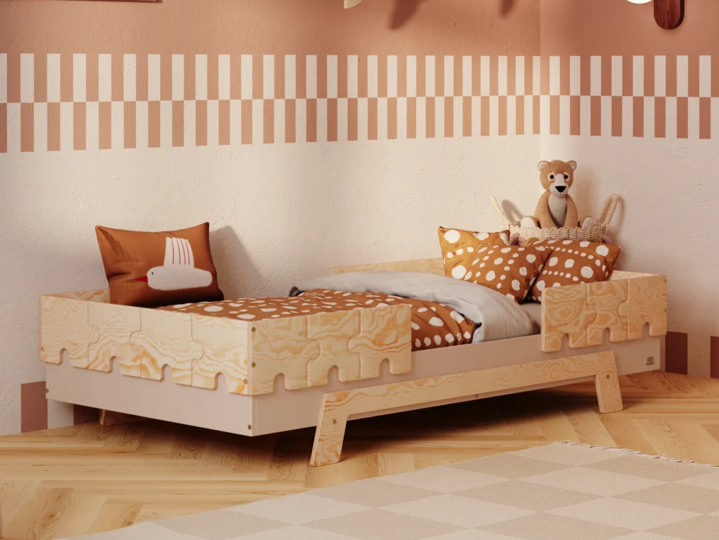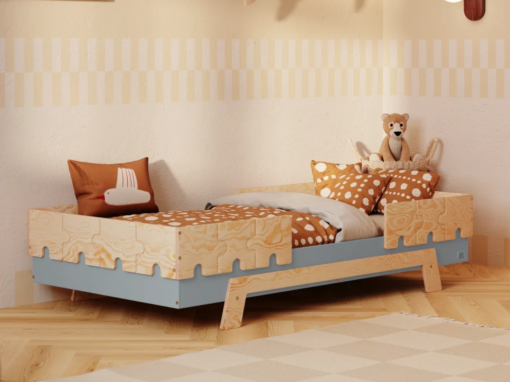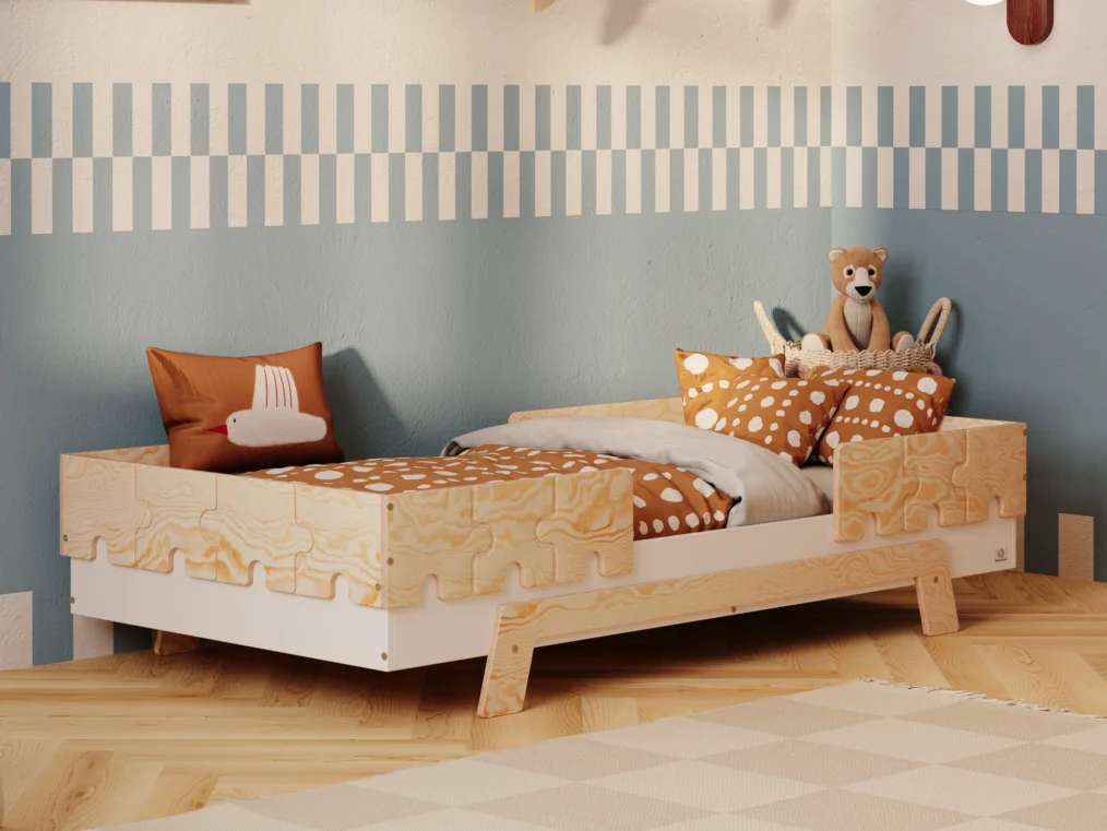 Lit simple enfant en bois avec barrières et sommier PUZZLE BR2 Montessori