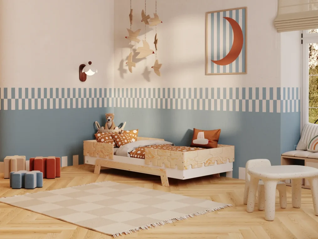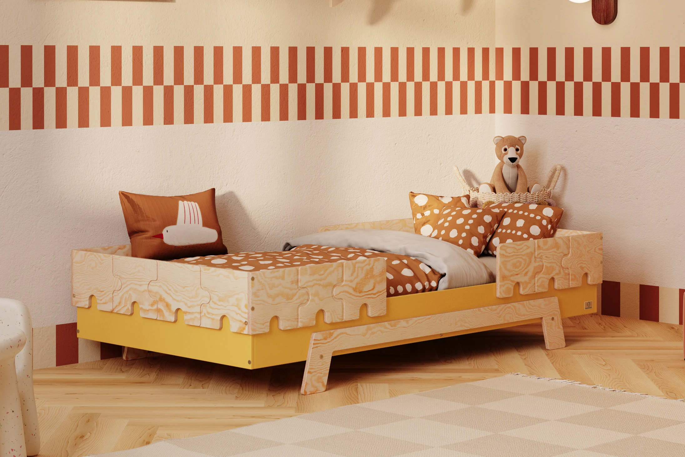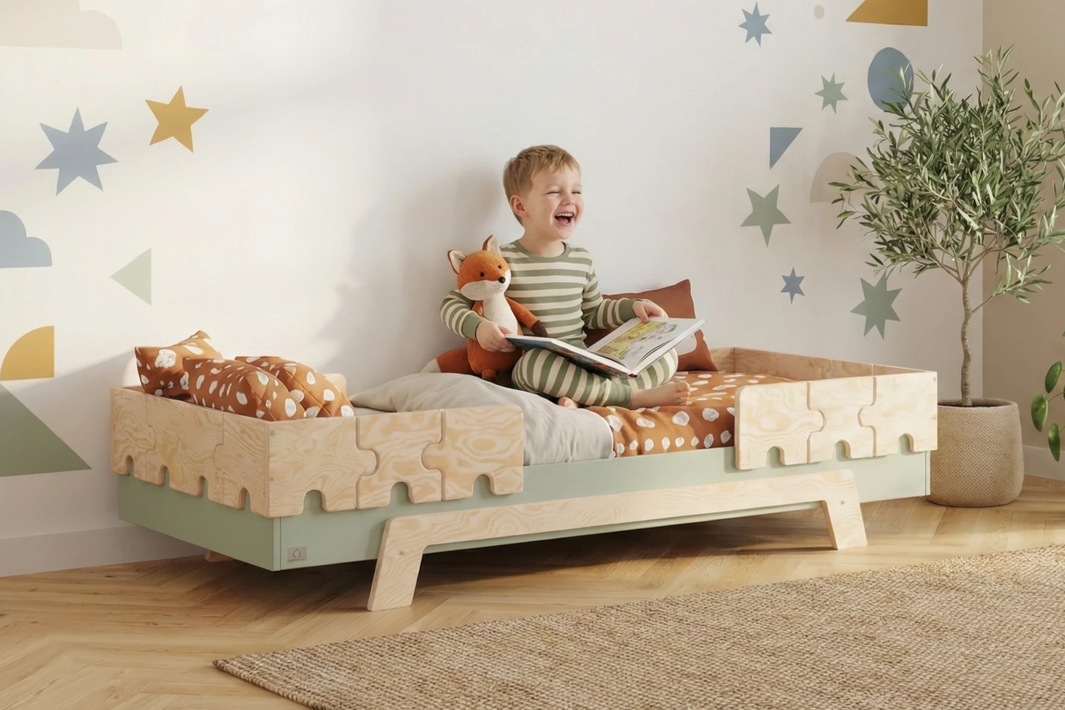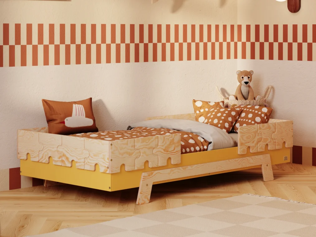 Lit simple enfant en bois avec barrières et sommier PUZZLE BR2 Montessori
