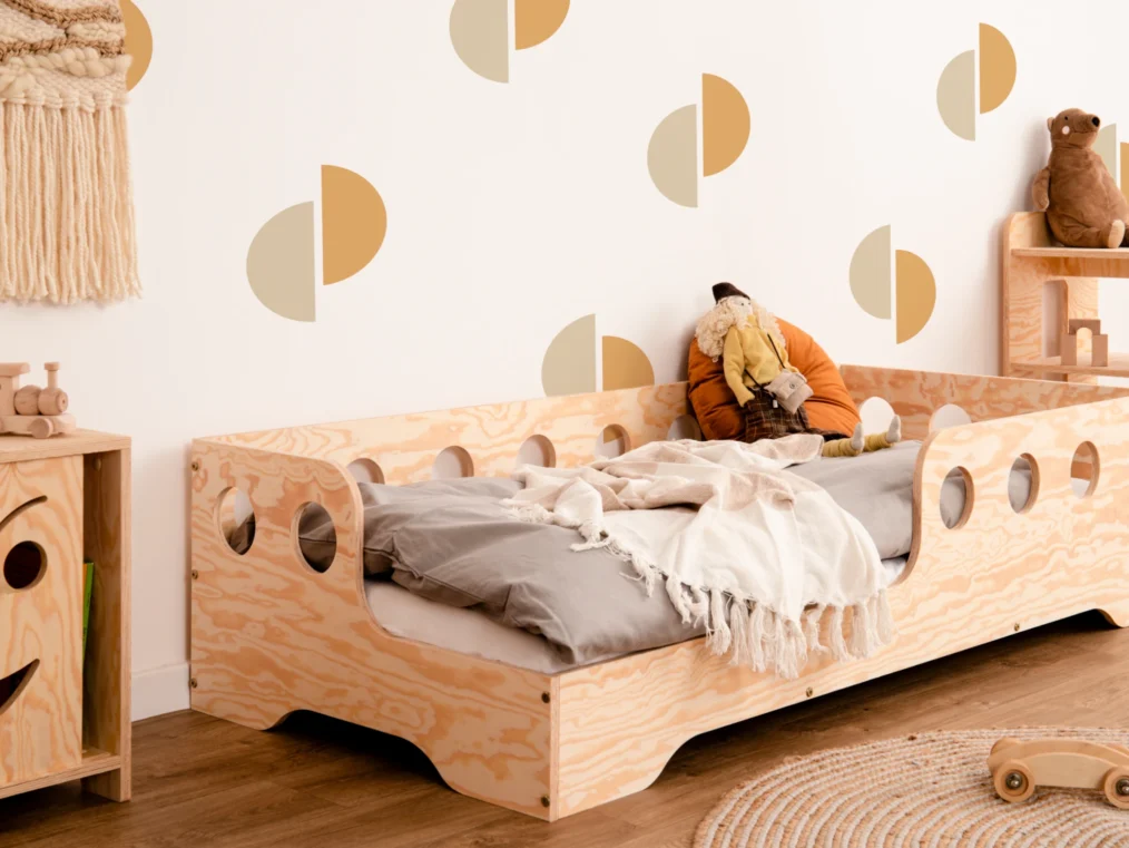 Lit simple enfant TILA 5 se distingue par un design moderne agrémenté de découpes décoratives en forme de cercles, apportant légèreté et style.