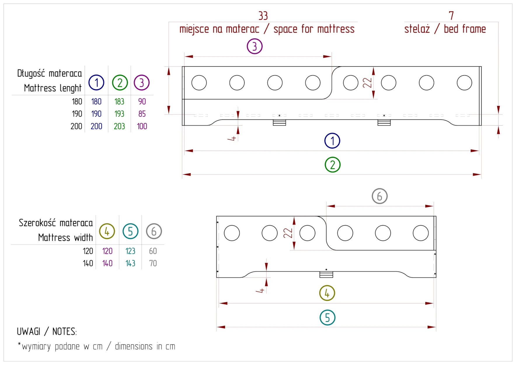 Les petites dimensions sont équipées d’un sommier à lattes courbées, tandis que les tailles à partir de 120 cm de largeur disposent d’un sommier à lattes droites.