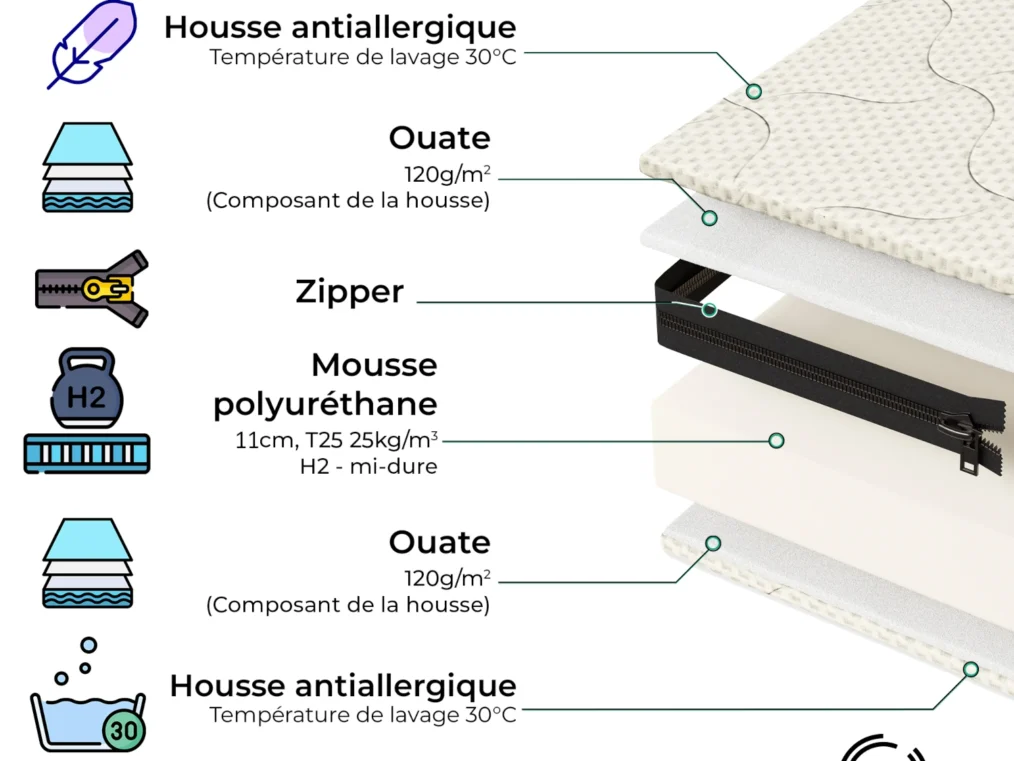 Grâce à une fermeture éclair, la housse peut être retirée rapidement et lavée à 30 °C, permettant de maintenir le matelas dans un état de propreté impeccable.